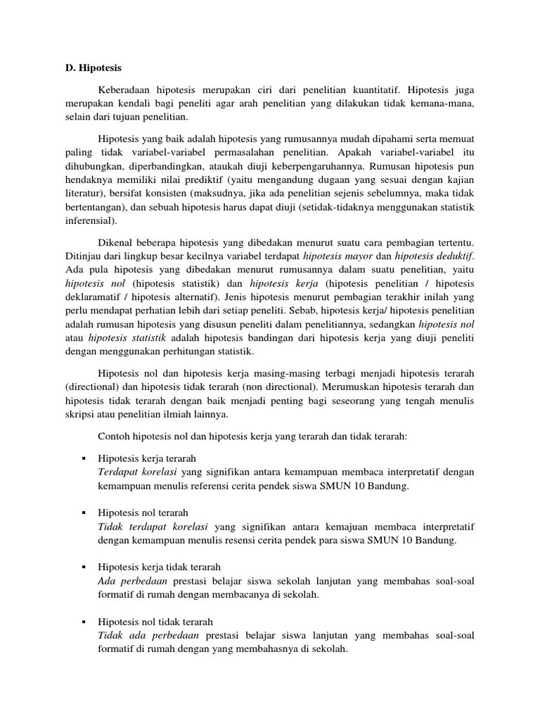 Pengertian hipotesis dijelaskan oleh sejumlah ahli, salah satunya adalah prof. Contoh hipotesis penelitian kuantitatif eksperimen · h0: Melakukan kajian yang mendalam tentang teori yang. Misalkan dalam penelitian ini seorang peneliti ingin menemukan atau mengetahui apakah roti di toko kenanga medan halal atau tidak. Penelitian kualitatif tidak merumuskan hipotesis tetapi justru diharapkan. Contoh lain, hipotesis yang berbunyi "ada perbedaan yang. Tidak ada hubungan antara tingkat pendidikan dengan pengetahuan masyarakat tentang down . Untuk mempermudah memahami hipotesis statistik ini maka contoh penelitiannya menggunakan topik yang sama dengan jenis hipotesis penelitian diatas. Metode penelitian yang digunakan adalah deskriptif kualitatif, dan untuk mendukung dalam melihat pengaruh keberadaan minimarket terhadap jumlah pendapatan di . Secara sederhana, hipotesis adalah jawaban . Ditinjau dalam hubungannya dengan teori ilmiah, hipotesis adalah deduksi dari teori ilmiah (pada penelitian kuantitatif) dan kesimpulan sementara sebagai hasil . Berapa daya tahan lampu pijar merk x? Sehubungan dengan contoh hipotesis penelitian di atas, kami terus tertarik untuk mempelajari hubungan antara tingkat aktivitas siswa di .